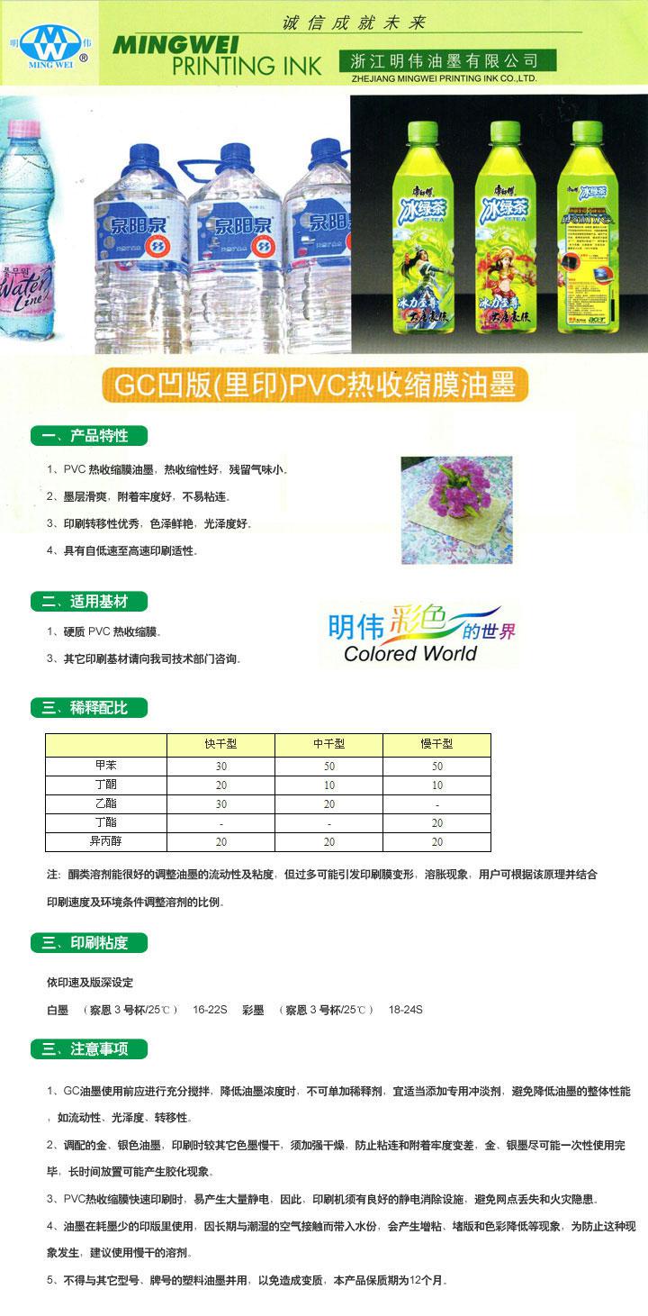 GC型油墨适用热收缩PVC膜印刷,适用于低速至高速凹版印刷机。油墨颜色鲜艳,附着力强、热收缩性优异,具有耐压,耐刮,滑爽、抗粘等特性。广泛应用于矿泉水标签及饮料标签等印刷。