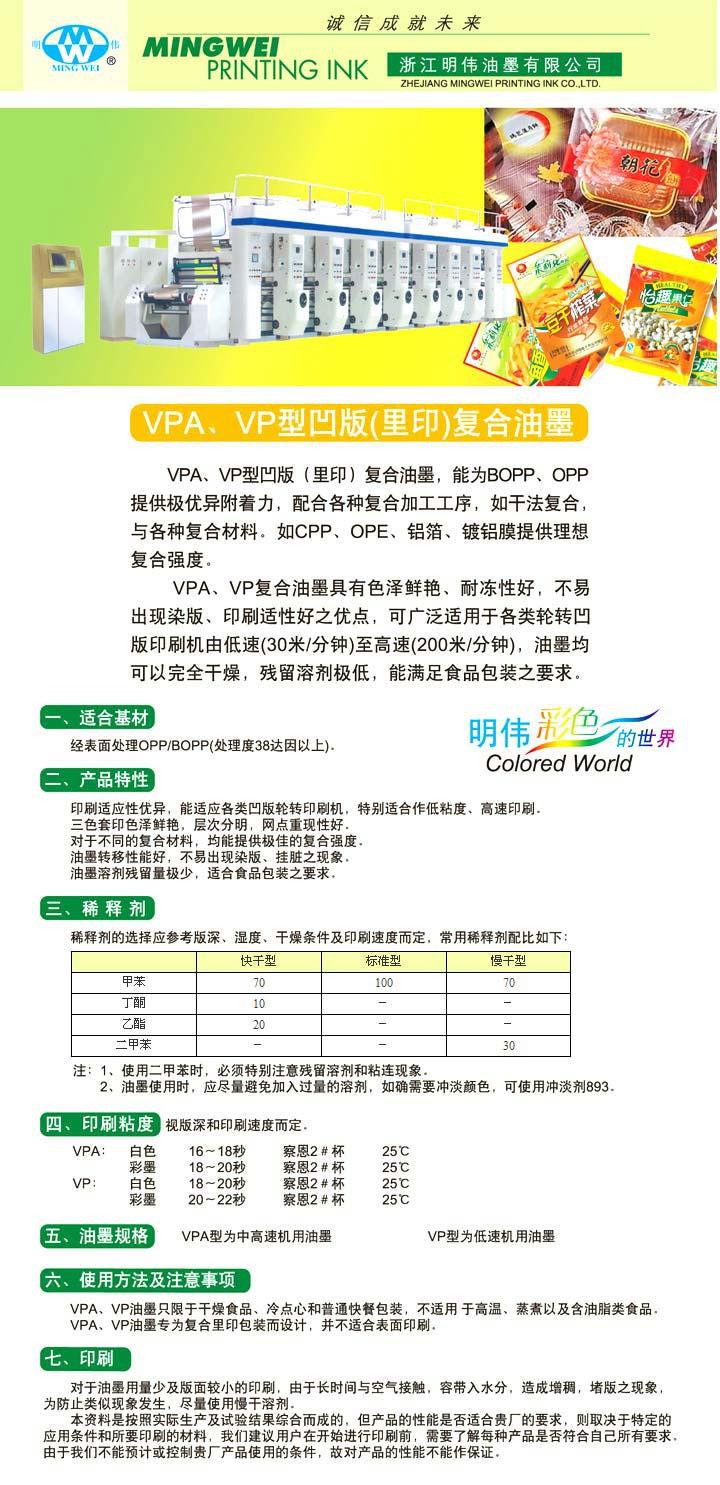 VPA、VP型凹版(里印)复合油墨,能为BOPP、OPP提供极优附着力,配合各种复合加工工序,如干法复合,与各种复合材料。如CPP、OPE、铝箔、镀铝膜提供理想复合强度。 VPA、VP复合油墨具有色泽鲜艳、耐冻性好,不易出现染版、印刷适性好的优点,可广泛适用于各类轮转凹版印刷机由低速(30米/分钟)至高速(200米/分钟