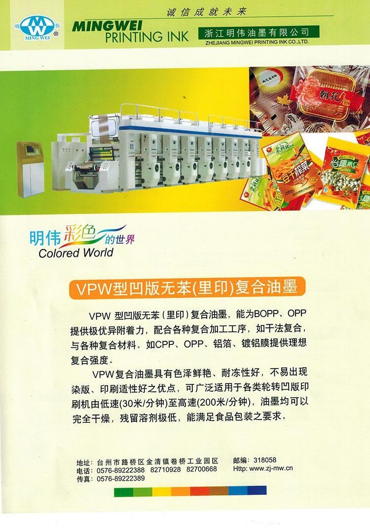 VPW型凹版无苯(里印)复合油墨,能为BOPP、OPP提供极优附着力,配合各种复合加工工序,如干法复合,与各种复合材料。如CPP、OPE、铝箔、镀铝膜提供理想复合强度。 VPA、VP复合油墨具有色泽鲜艳、耐冻性好,不易出现染版、印刷适性好的优点,可广泛适用于各类轮转凹版印刷机由低速(30米/分钟)至高速(200米/分钟)